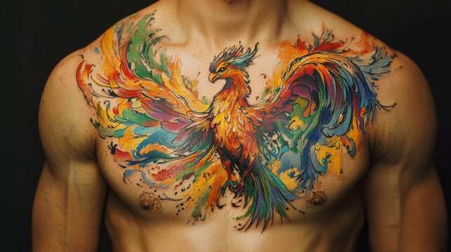 A chest tattoo of a phoenix rising from the ashes, with vibrant colors and detailed feathers