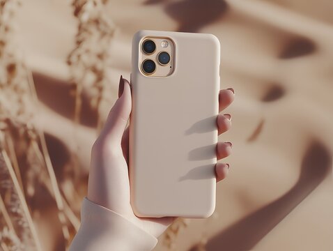 Phone case mockup, Woman's hand holding a beige phone case against a blurred nature background, ideal for showcasing mobile accessories, app designs, or product promotions