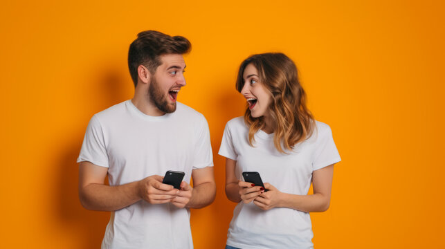 young man and woman are both holding smartphones and smiling at each other, with a bright orange background
