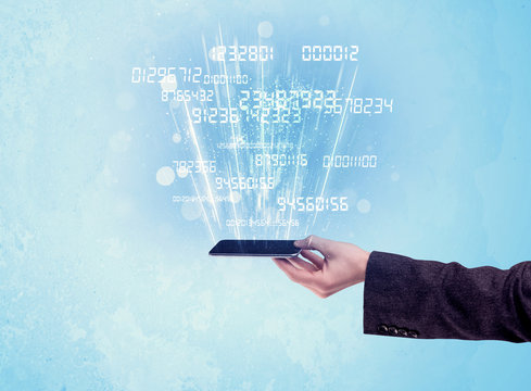 Hand holding phone with digital numbers