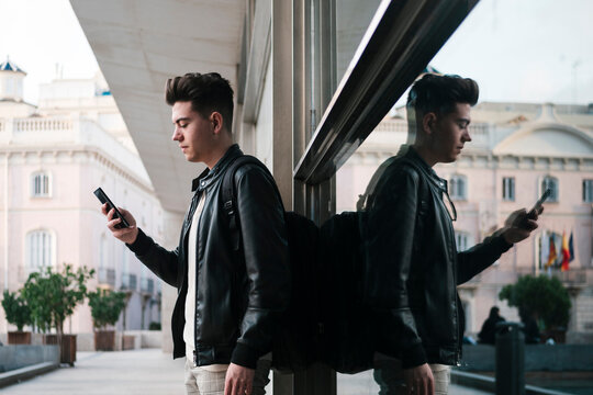 Businessman walking in transit atrium talking on smartphone, reflective glass overlays