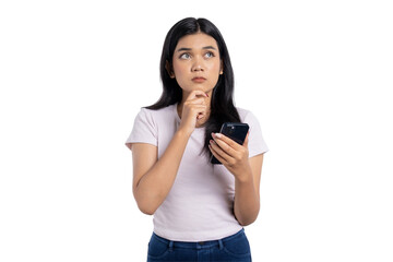 Pensive young Asian woman looking up, holding smartphone and thinking, isolated on transparent background