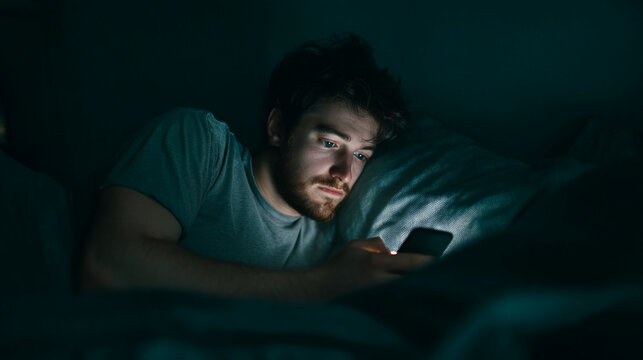 Man in bed at night using smartphone, dimly lit scene, conveying loneliness or late-night phone use habits