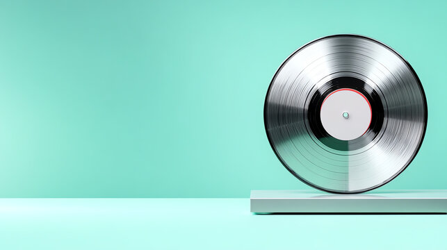 A vintage vinyl record displayed on a sleek surface against a mint backdrop, perfect for music-themed projects.