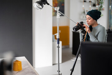 Black young girl with cornrows hairstyle taking photos of minimal product setup with DSLR camera while working in professional studio copy space