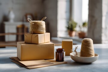 sustainable packaging station with kraft paper, natural twine, and ink stamp