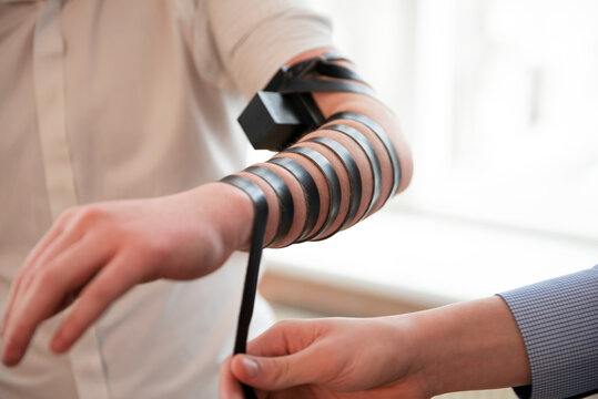 The Young Jewish man help to put on Tefillin on another Young Jewish man hand. Tefillin, or phylacteries, are worn by adult Jews during weekday and Sunday morning prayers.