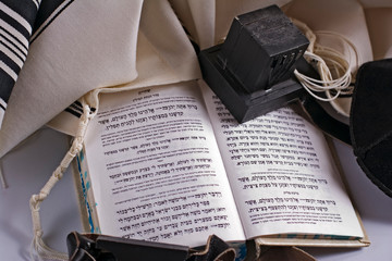 Tefillin  or  phylacteries . Pair of black leather boxes  for the arm and for the head with leather strips containing Torah verses that are worn Jewish men  prayers.  One box with hebrew letter Shin.