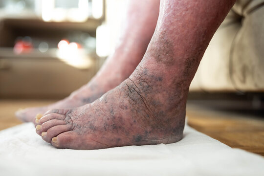 This image captures a pair of swollen feet and ankles, illustrating the physical effects of edema amid the familiar comforts of a home environment and personal care.