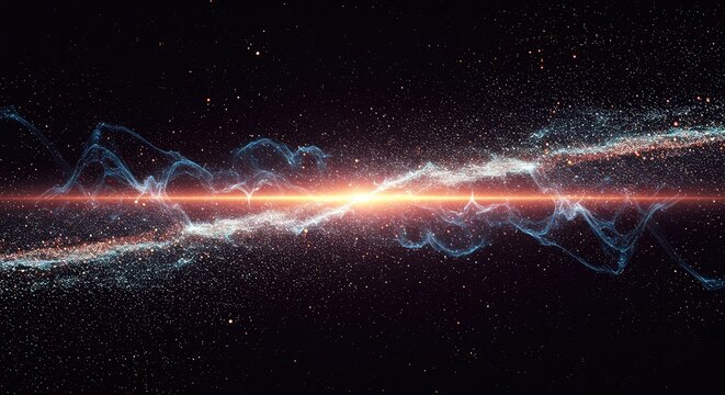 Abstract quantum physics background showing energy duality. Glowing particles merge with flowing light waves in a deep space setting ,particle ,futuristic ,abstract