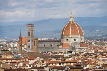 Scenic view of Florence from Piazzale Michelangelo, with cathedral on the background. Blue sky and a couple walking. Tuscany region, Italy.