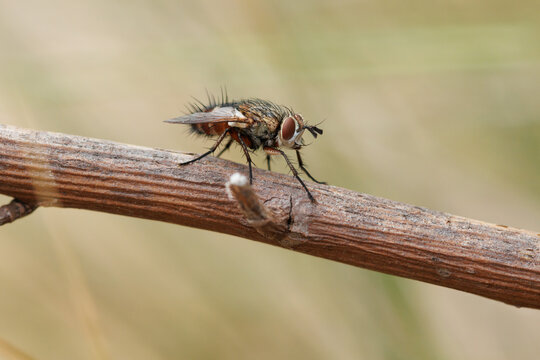 Mosca de los establos o mosca picadora (Stomoxys calcitrans) posada sobre ramita en el parque natural Sierra de Mariola, Alcoy, España