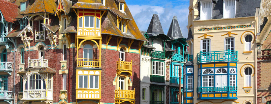Famous facades on the seaside of Mers-les-Bains, limit of Hauts-de-France and Normandy. France