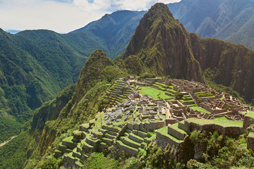 Ruins of Machu Picchu and Huayna Picchu covered by mystical cloud. Panoramic summer view from above.
