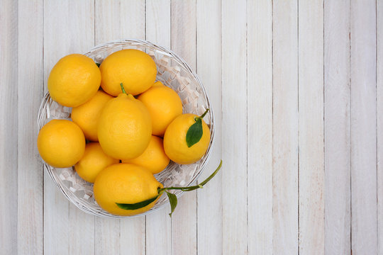 High angle shot of a basket of fresh picked lemons on white wood table. Horizontal format with copy space.