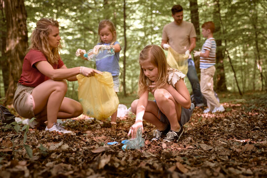 Family collecting trash on sunny beach for environmental awareness