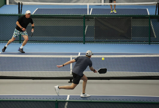 A young player prepares to hit a ball during an energetic pickleball game on outdoor courts in bright sunlight