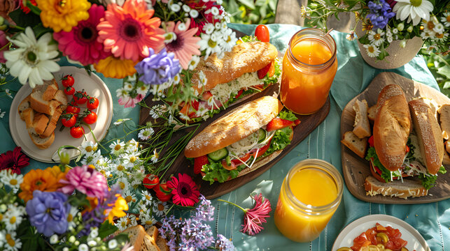 Flatlay of Spring Picnic: Sandwiches Juice and Flowers, in high resolution clean minimal style stock photo illustration background image ideal for templates advertisements and web banners showcasing m