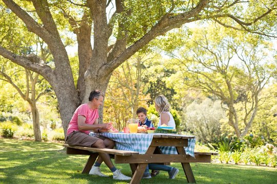 Happy diverse family enjoying outdoor picnic