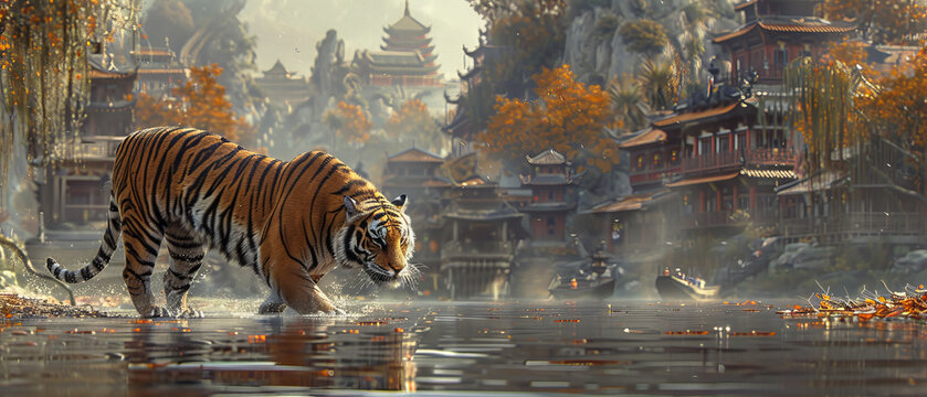 A tiger walking along a riverside street in a picturesque town