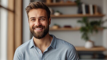 portrait of a man | Head shot portrait smiling confident millennial man looking at camera, standing at home, happy positive bearded young male, businessman or freelancer posing for photo, profile pict
