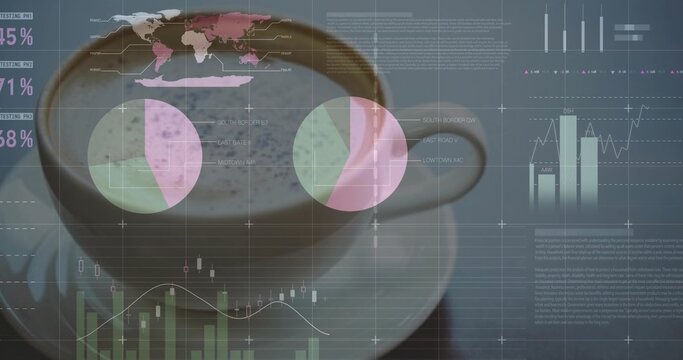 Displaying ceramic coffee cup resting on saucer at desk, showing pie charts, world map, dashboard