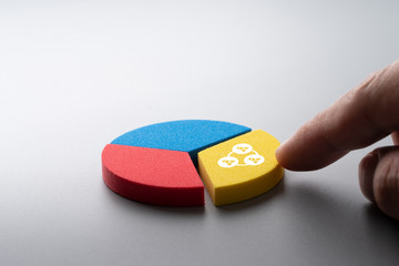 Colorful 3d pie chart is lying on a white surface, representing market share with six segments