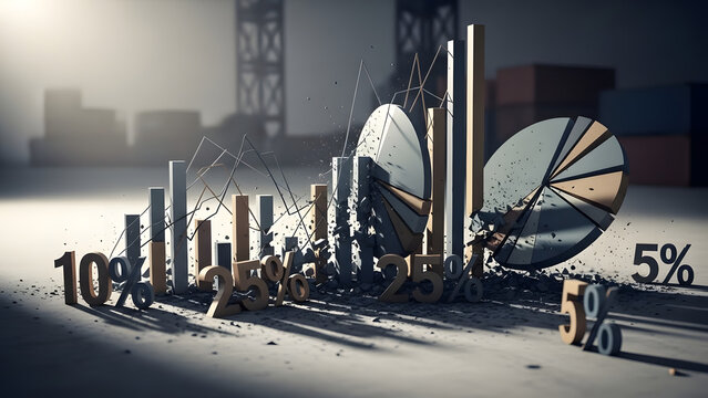 Statistical charts and pie graphs disintegrate into rubble with percentages, symbolizing economic collapse and market downturn.