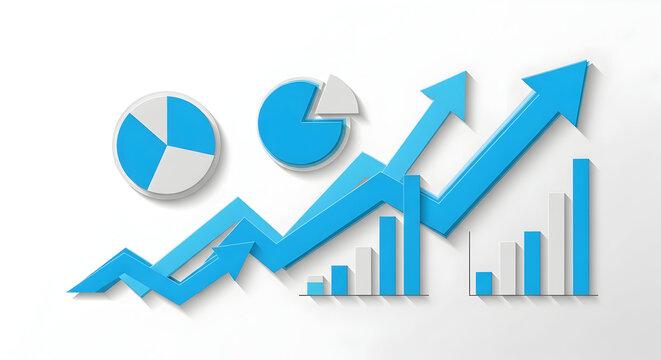 Modern 3d illustration of a financial analytics dashboard showcasing upward trend graph pie charts and bar charts in light blue on white background