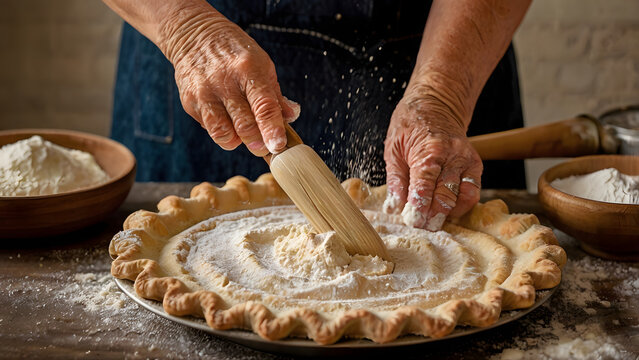 Elderly hands sprinkling flour over homemade pie crust with vintage baking tools in background
