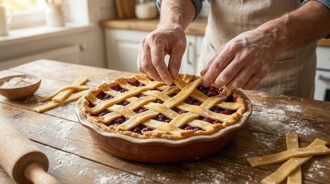 Baker weaving a lattice crust on a homemade berry pie, hands dusted with flour and wearing an apron. Rustic kitchen setting with natural light. British Pie Week