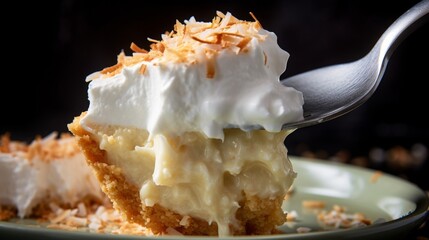 Spoon digging into coconut cream pie in detailed view