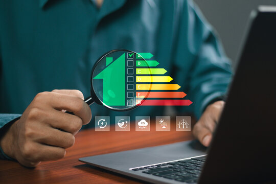 Energy efficiency concept, Businessman using laptop with energy efficiency rating icons for energy efficient house building rate label audit.