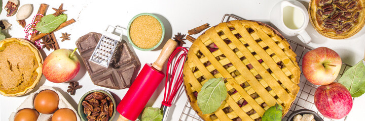 Apple pie raw American traditional dessert pastry baked food preparation recipe with ingridients flat lay