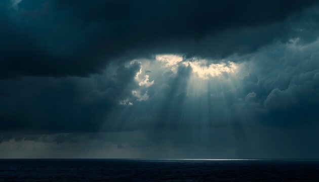 Dramatic stormy seascape with sun rays piercing through dark clouds