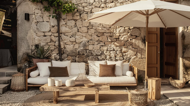 salon de plein air en bois et coussins blanc dans une cour avec murs en pierre rustique