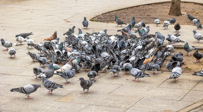 Pigeon infestation in the city center; Large groups of city pigeons gather to eat bird seed that has been spread out