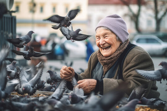 An older woman smiling as she feeds a flock of pigeons in a vibrant city square, elderly happy people, old age, bokeh Generative AI