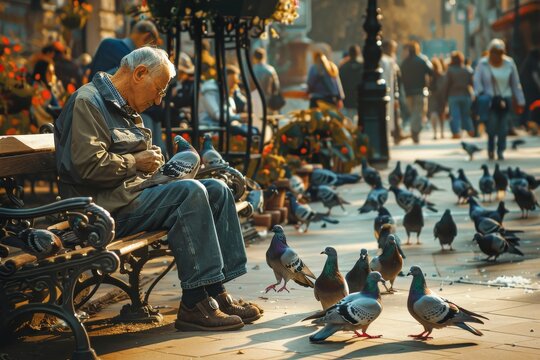 Senior man sitting on a bench while surrounded by a flock of pigeons being fed, A senior citizen sitting on a bench feeding pigeons in a bustling city square