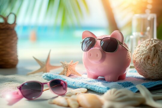Colorful piggy bank and sunglasses rest on a sunny beach towel, surrounded by seashells and starfish, symbolizing summer savings and financial relaxation.
