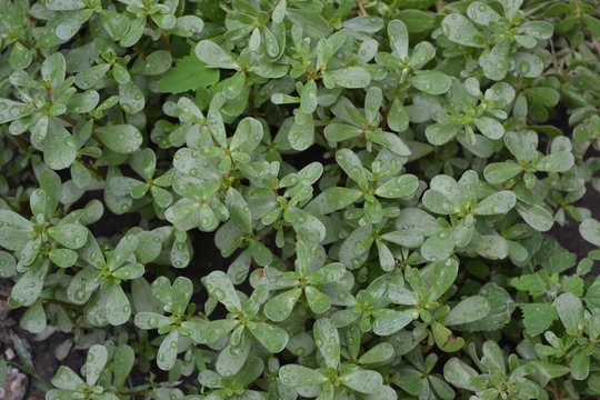 Home garden, flower bed. Gardening. Green leaves, bushes. Purslane, annual herbaceous succulent plants. Portulaca oleracea. Tasty and healthy
