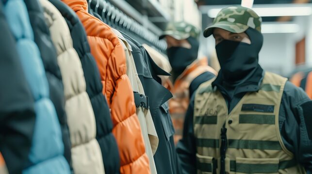 Burglars in a clothing store, stealing designer clothes, organized heist