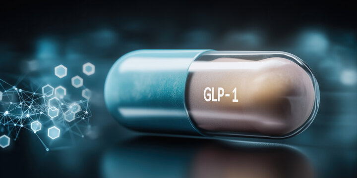 glp-1 weight loss pill -Modern pharmaceutical capsule surrounded by floating molecular structures and hexagonal chemistry symbols.