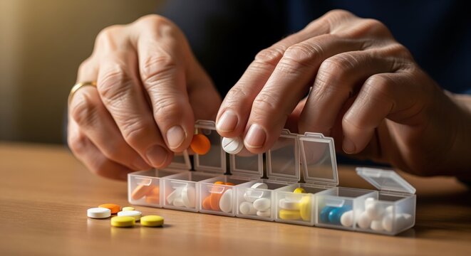 Elderly hands carefully organizing colorful daily pills and vitamins into a transparent pill organizer for health management.