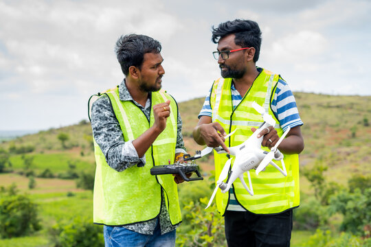 Side view positive bearded man teaching beaming kid to control helicopter. He describing instruction him. They wearing modern earphones
