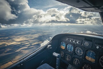 Pilot's view from a small airplane cockpit during flight over an open field