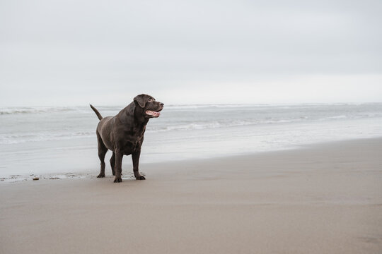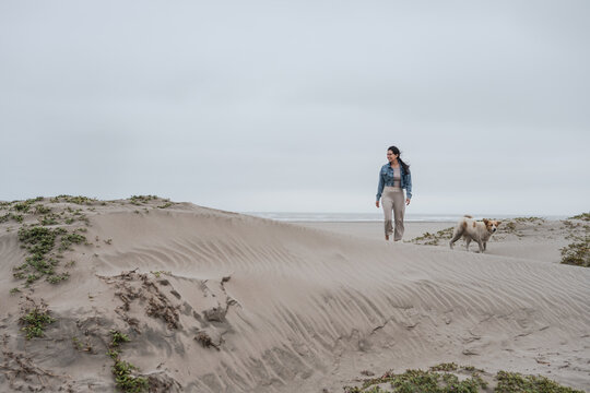 Woman Walking Dog on Sandy Dunes on cloudy day