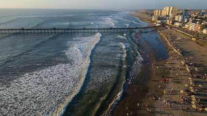 Drone photos of Pimentel Beach, Peru, capturing the pier, rolling waves and crowds enjoying a warm summer day on the northern coast. Ideal for travel, tourism and coastal destination content