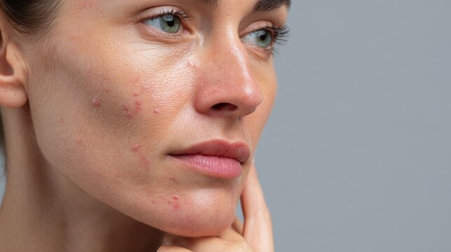 Studio closeup of young woman with acne on cheek and jawline, skincare concept, white background.