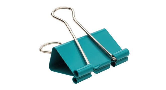 Isolated teal binder clip stationery item holding papers together in the home or office place